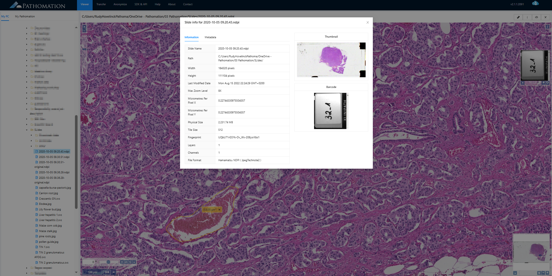 PMA.start allows you to anonymize local images before sharing and uploading them to My Pathomation, helping you to be compliant with privacy regulations and facilitating the use of your slides for teaching and research collaborations. The anonymization is a one step automatic process creating a copy without the slide label metadata.